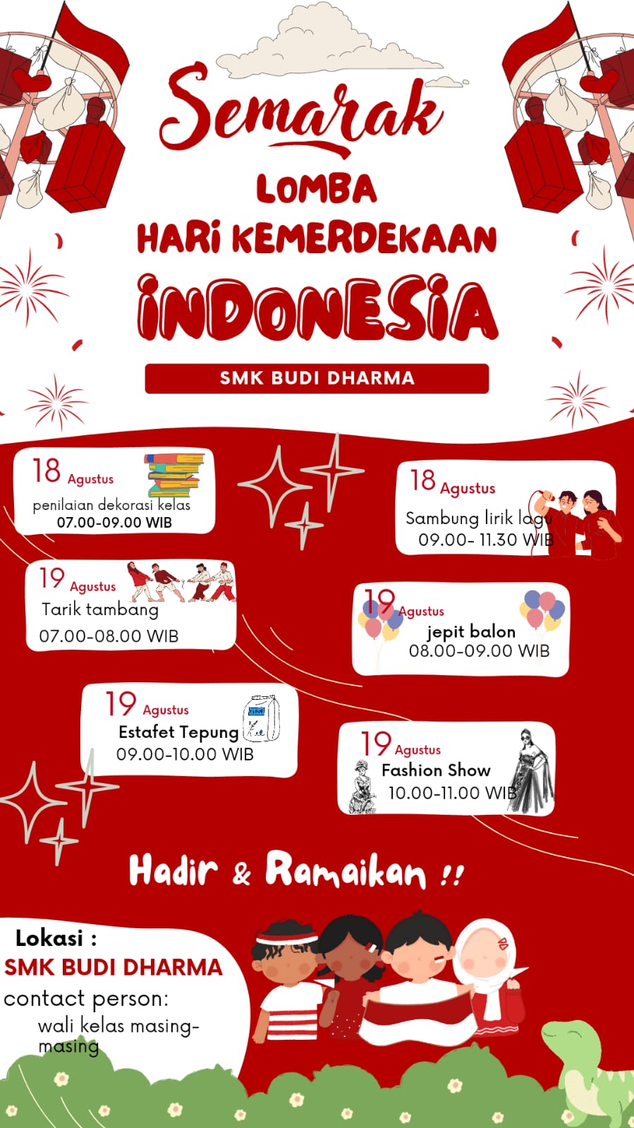 Dalam rangka menyambut Hari Kemerdekaan, SMKS Budi Dharma Dumai juga mengadakan lomba dengan berbagai variasi, yang di ikuti oleh seluruh siswa. Lomba yang di adakan yaitu Dekorasi Kelas, Sambung Lirik Lagu, Tarik Tambang, Jepit Balon, Estafet Tepung dan Fashion Show Daur Ulang. Perayaan hari kemerdekaan perlu dilakukan karena 17 Agustus adalah hari bersejarah bagi bangsa Indonesia dan juga untuk mengenang jasa para Pahlawan bangsa.
